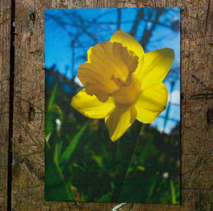An A6 greetings card of a daffodil, harbinger of spring. Also the national flower of Wales, maybe a gift for St. David's Day? From an original digital image.