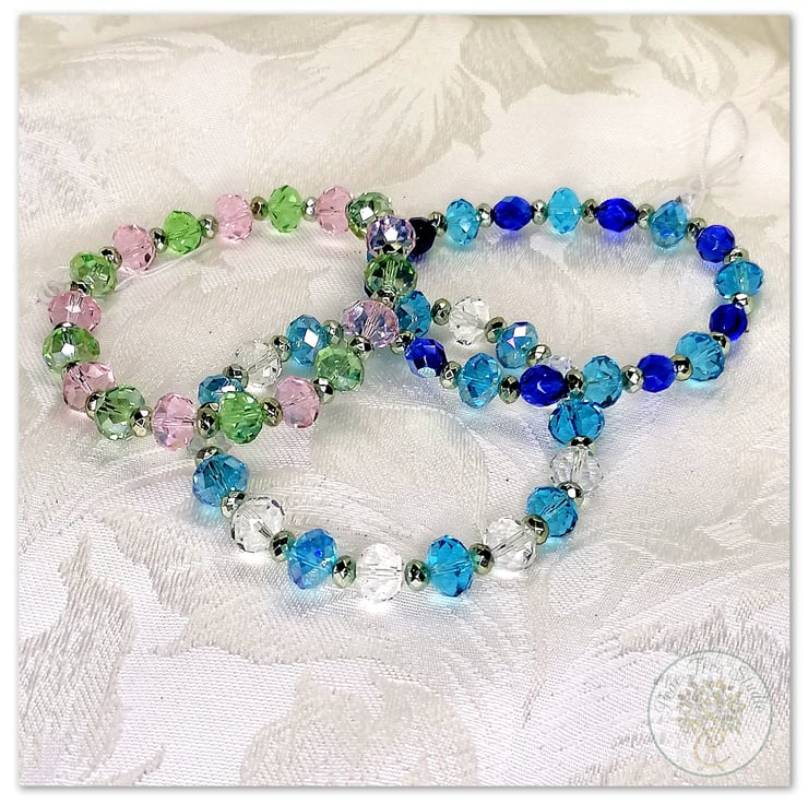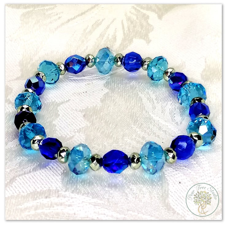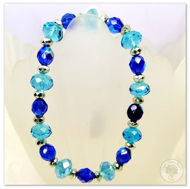 Stylish bracelet with dark blue and light blue crystal beads with silver coloured spacer beads. Elasticated bracelet, perfect for special occasions or everyday wear.