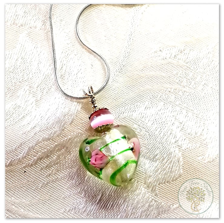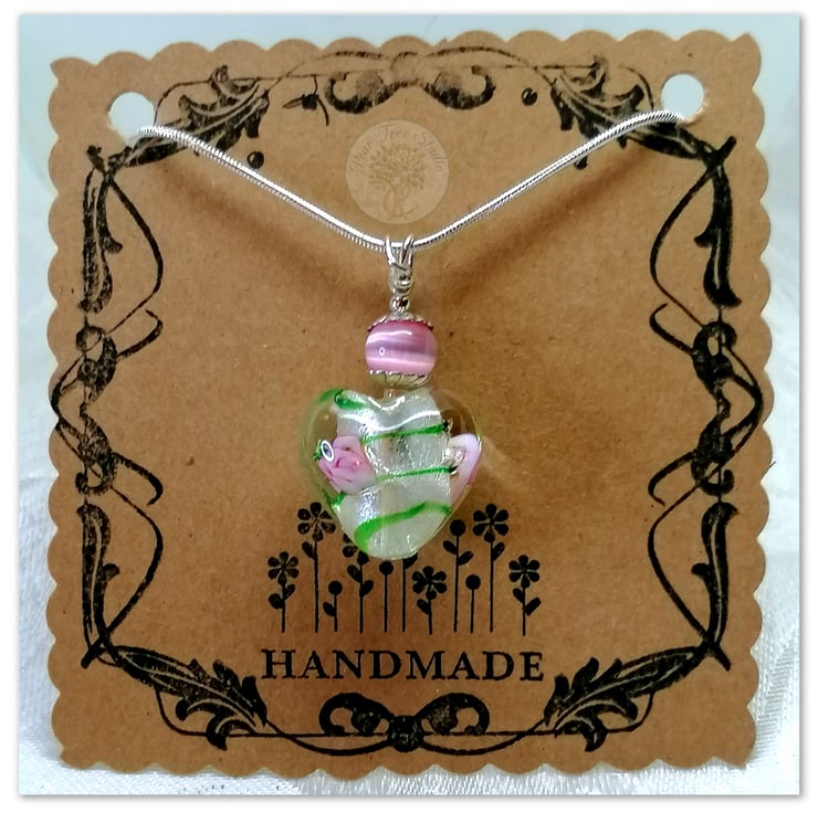 Handmade Murano glass heart pendant white with pink and green pattern on a silver plated snake chain.