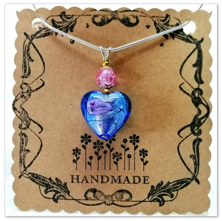 Handmade Murano glass heart necklace blue with pink pattern on a silver plated snake chain.