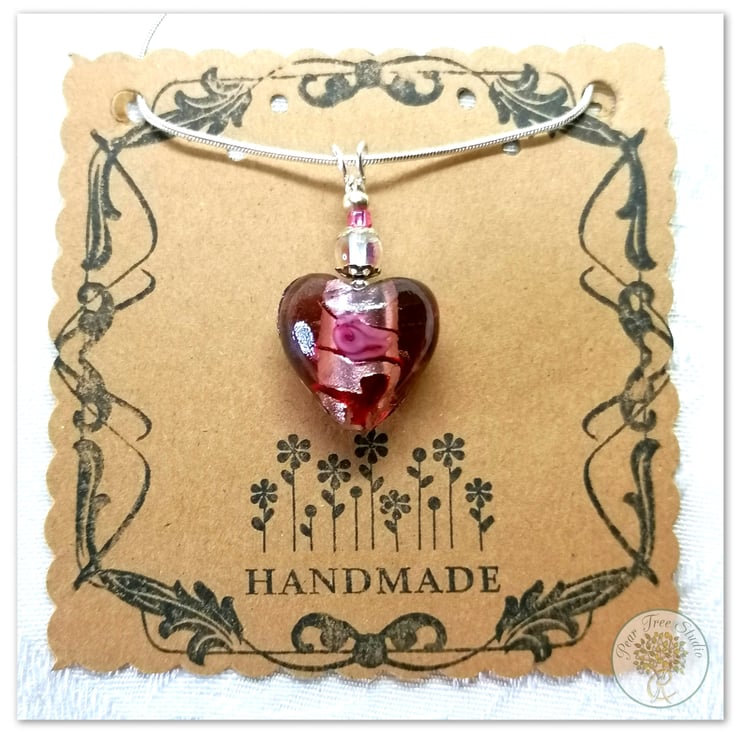 Handmade Murano glass heart necklace. Dark pink glass heart on a silver plated snake chain.