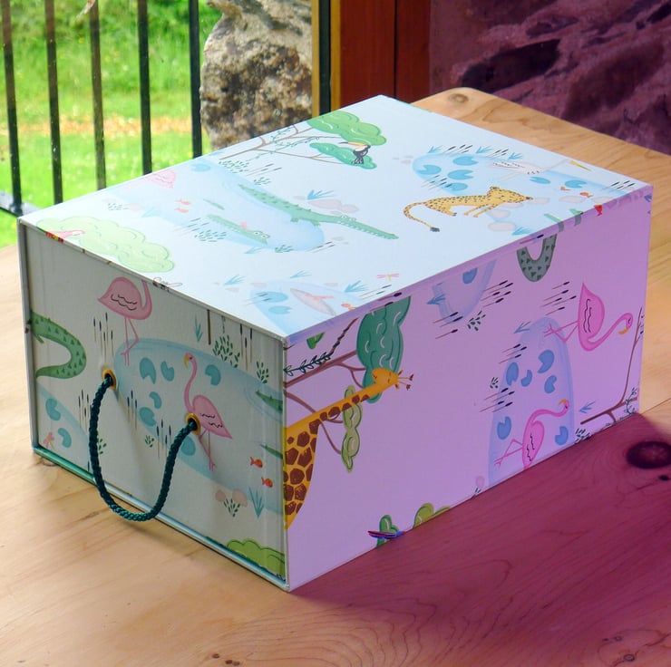 Wanting to have an organised home, especially when it comes to increasing numbers of children's toys, but wanting to avoid the ugly plastic storage you often find! Beautiful, handmade storage drawer in an interior design paper - perfect for a playroom, nursery, or living room shelf.
