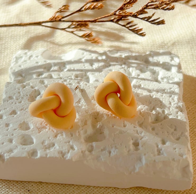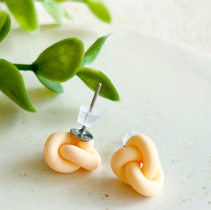 WHILE CREATING THESE STUDS, I PERSONALLY MIX THE CLAY TO ACHIEVE THE PERFECT PASTEL SHADES—ensuring each pair has a soft, satin matte finish. Every knot is hand-sculpted in my UK studio without the use of molds. This manual process means your earrings are truly one-of-a-kind, with subtle details that mass-produced jewelry cannot replicate.