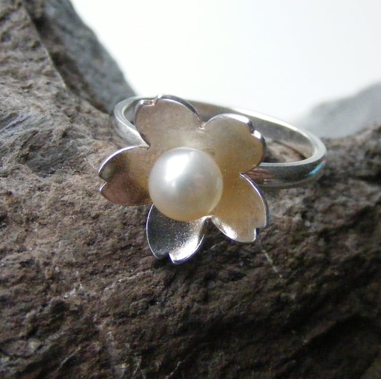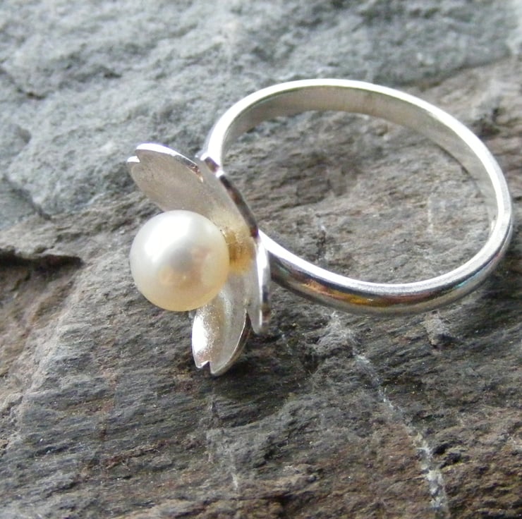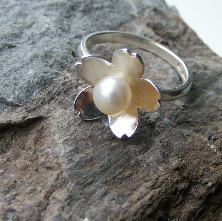 This pretty ring is modern in design, with the simple flower being slightly concave and refecting the pretty white cultured pearl.
