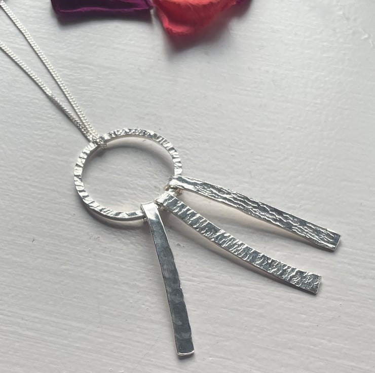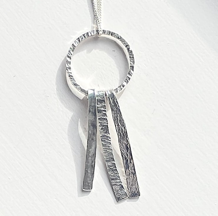 Stunning hand forged silver statement pendant. Made entirely from 925 sterling silver, this piece has been made using many traditional tools and techniques including forging and hammering. The main circle is heavy and solid and measures 2.4 cm diameter. At its longest length the pendant measures 6cm. Everyone will notice it. The chain is a gorgeous diamond cut curb chain. Truly a one off piece.