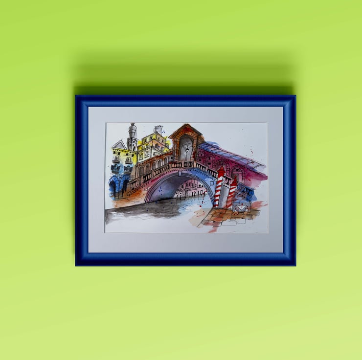 This is a stylised watercolour and ink illustration depicting a scene of the Rialto Bridge over the Grand Canal in Venice.