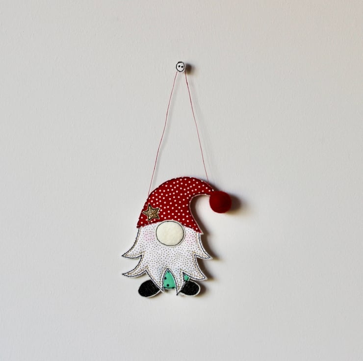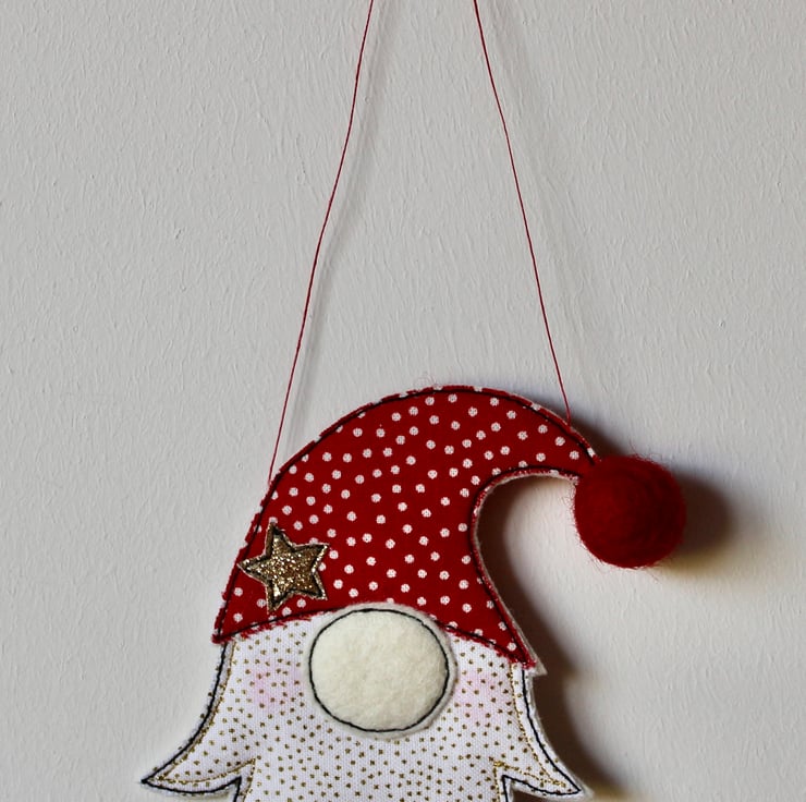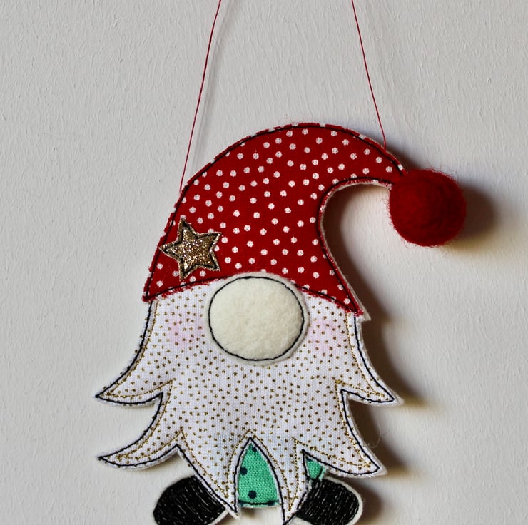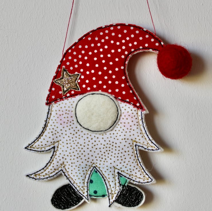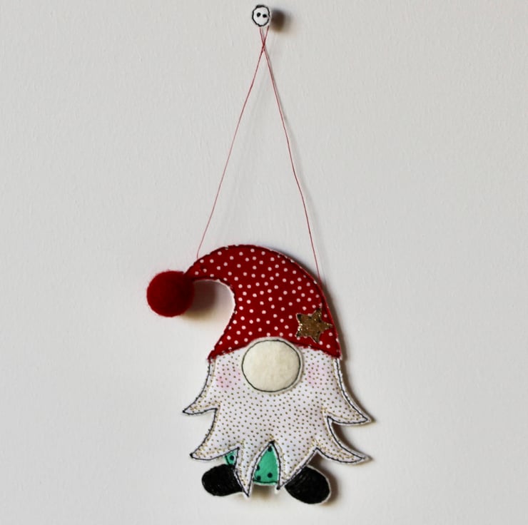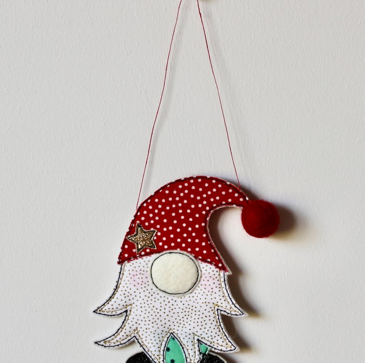 A delightful hanging decoration which is created using multiple layers of 100% wool felt, cotton cloth, glitter fabric, a handmade wool felt ball and free hand machine embroidery. It is cut out by hand using a very sharp pair of scissors.