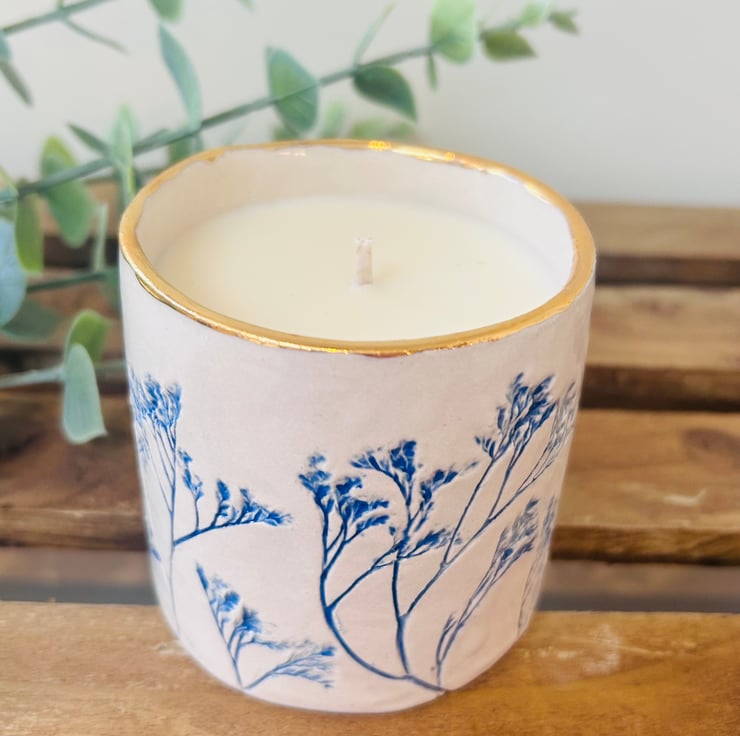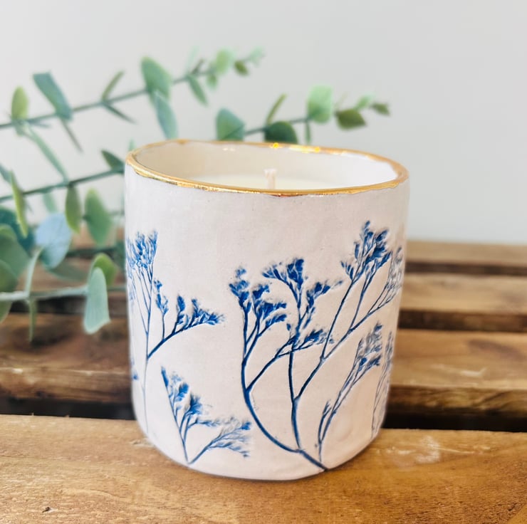 Each pot is hand-built and pressed with plants or herbs from my garden. Some have the little addition of a bee. Each one is finished with a gold rim which really brings these pots to life! The herbal & woody scented candle features notes of Cedarwood, Basil, Cypress & Black Pepper. It’s an absolutely beautiful scent and a popular one in the True Grace range. Each candle burns for approximately 30hours so a lovely long time to enjoy this gorgeous scent.