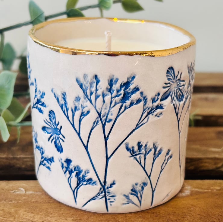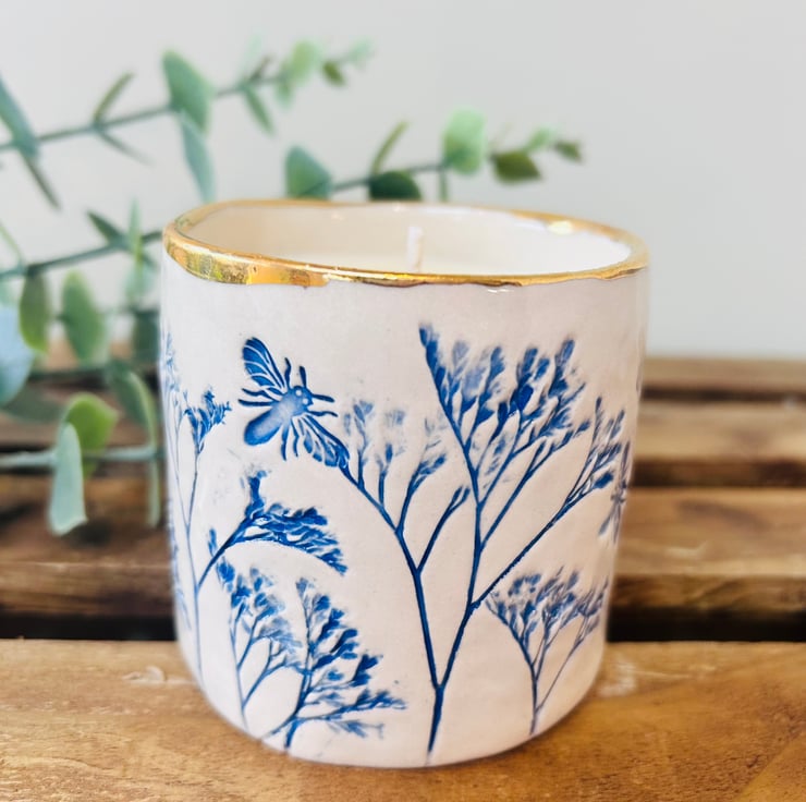Each pot is hand-built and pressed with plants or herbs from my garden. Some have the little addition of a bee. Each one is finished with a gold rim which really brings these pots to life!