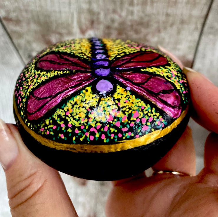 The stone is painted in black acrylic, artist quality paint, the dragonfly has lovely metallic finish wings and has a subtle texture to it.
