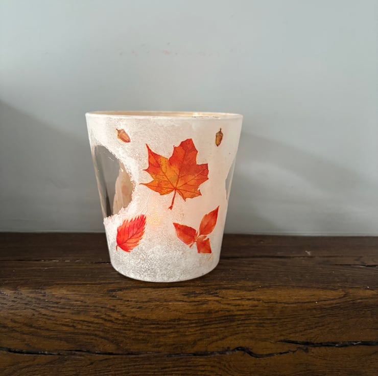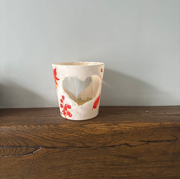 Glass candle holder with heart-shaped window to show tea-light candle. Decorated with autumnal-coloured leaves and berries. Perfect for cozy nights in with the curtains closed!