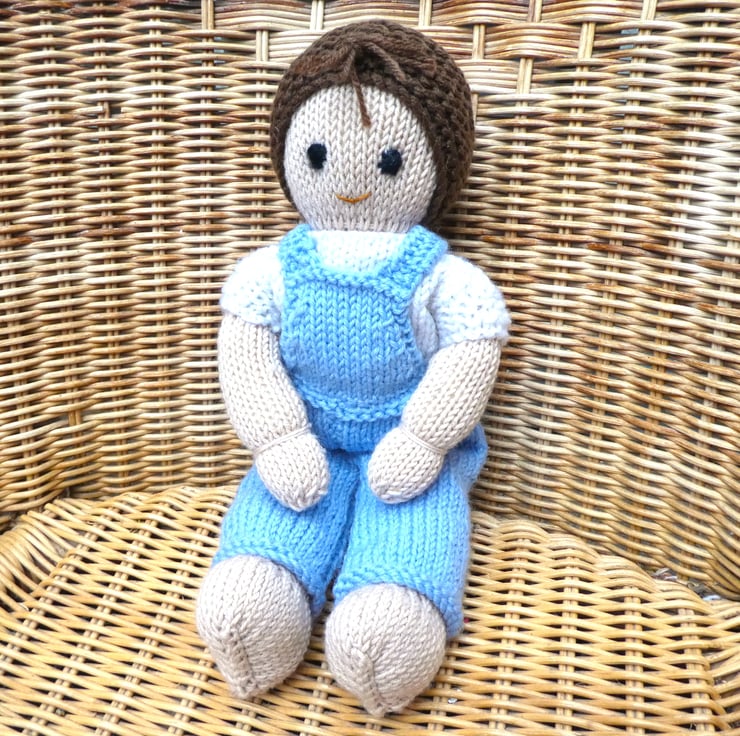 This is a very sweet little boy hand knitted in Merino wool, 12" tall with removeable dungarees, his cap of hair is acrylic and he is stuffed with lovely soft lambswool.