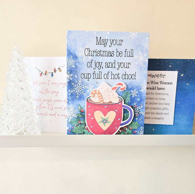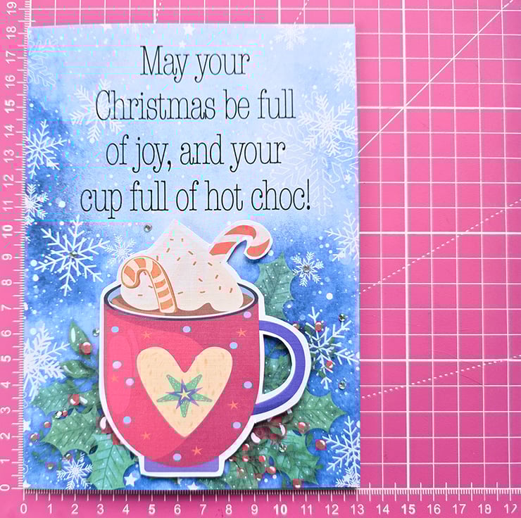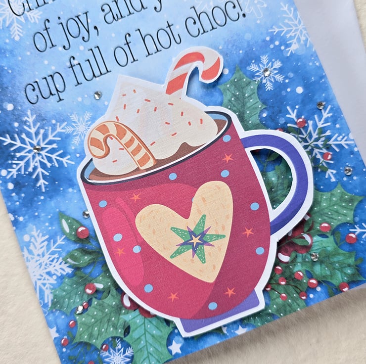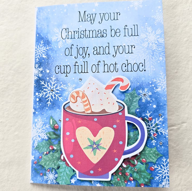This unique, handmade card is a perfect Christmas card for the Hot Chocolate fan in your life. The front features a charming illustration of Christmas foliage and a centrepiece of a cut-out cup of Hot Choc complete with candy cane. This is attached with a small foam pad to give it a cool 3D, raised effect and finished with a sprinkle of diamante. This subtle detail makes the card feel special and handcrafted.