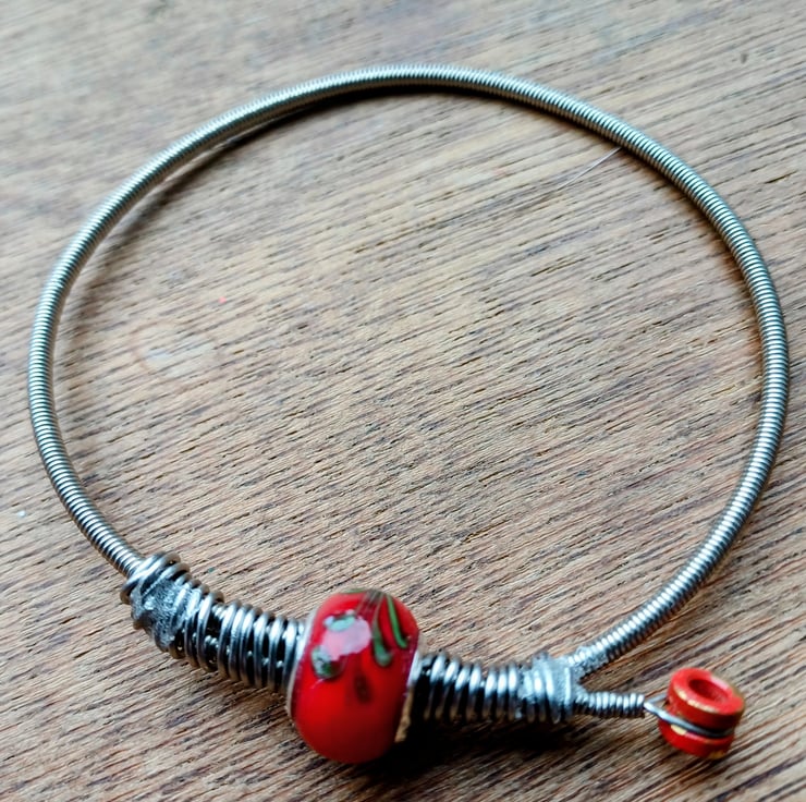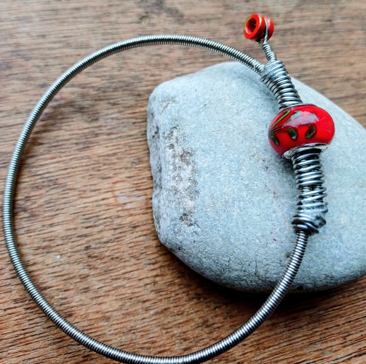 This is a funky bangle made from my sons used guitar string. (It has been sterilised and cleaned). Wrapped with silver wire and finished with a red bead (with touches of green and white) to match the red peg on the string. A cool gift for any guitarist ! It will fit any wrist size, but probably more suitable for a ladies wrist as it's on the small side.