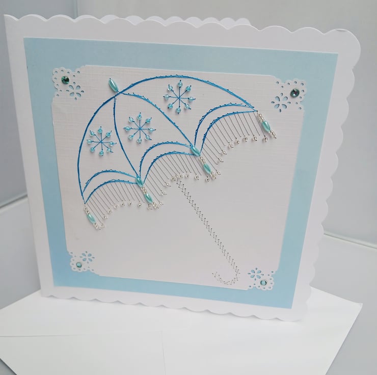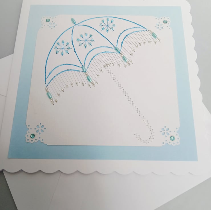 Cards, Blank with Umbrella Design Embellished with Beads. This card is a lovely unusual design of an umbrella embellished in 2 different colour beads and embroidery thread. It has a lovely background in an aqua colour with aqua and clear beads. Inside has the aqua background and is blank for you to write your sentiments on. The advantage of this is that it can be used for Birthday, wedding, thank you, congratulations etc.