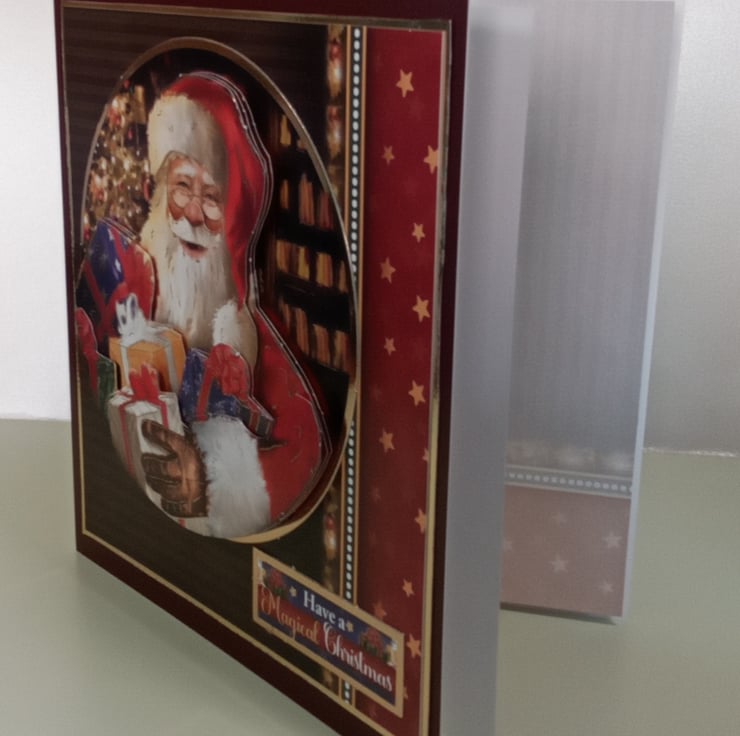 The topper features an image of Father Christmas with his arms full of Christmas gifts, it has been layered using foam pads to give a 3D finish. I have added it to a card blank onto which I havebplaced a layer of printed card with a border of stars down one edge, this has been layered onto gold to match the frame and highlights of the topper.