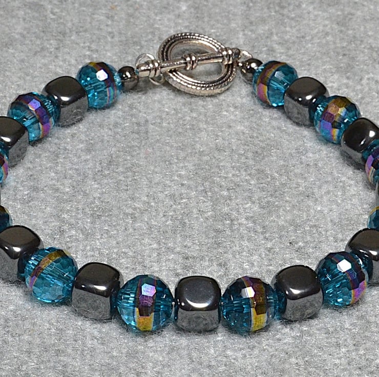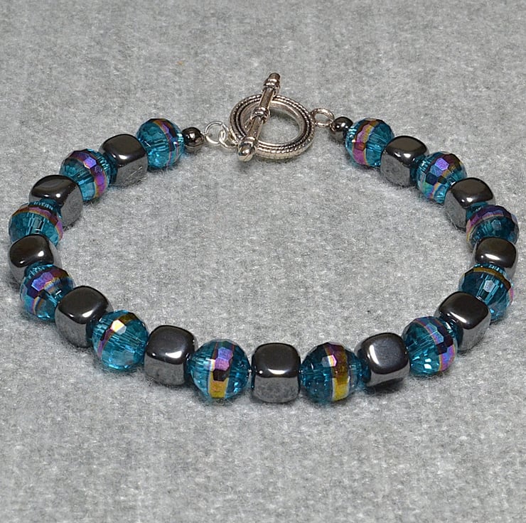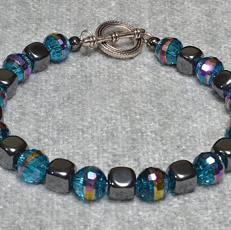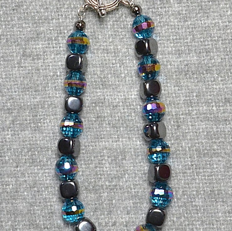 I love working with shiny and sparkly things, and this bracelet ticks both boxes. The smooth hematite cubes provide the shine. The sparkle comes from faceted blue glass crystal beads, with an AB band to add rainbows.
