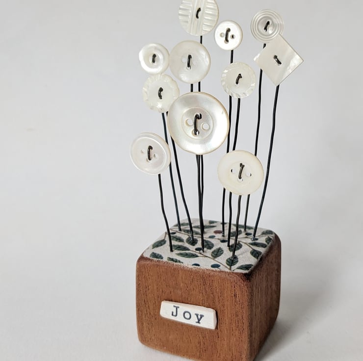 Standing on their wire stalks in a decoupaged wooden block an array of mother of pearl button flowers.