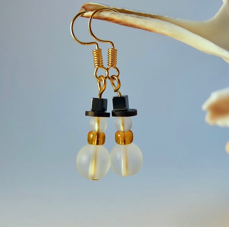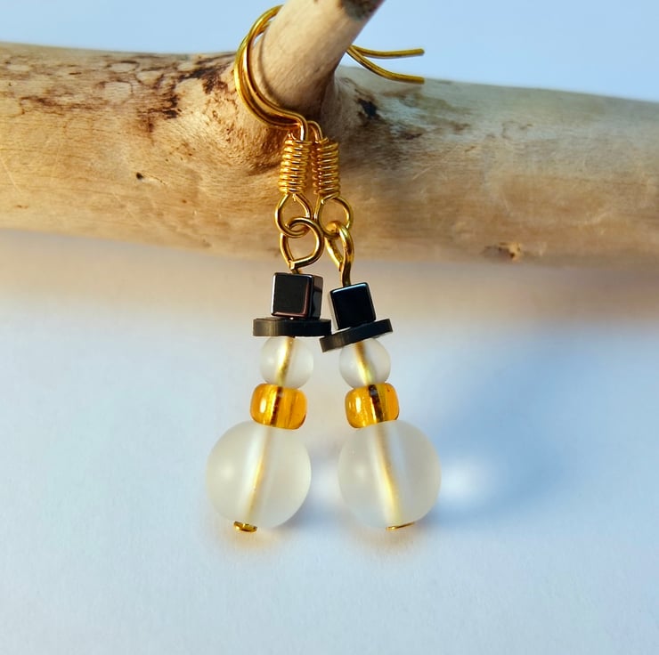Cute little snowmen earrings, made from frosted glass beads for the body and head, with a small, shiny golden glass seed bead for a scarf and a hat made from a polymer clay disc topped with a cube of hematite.