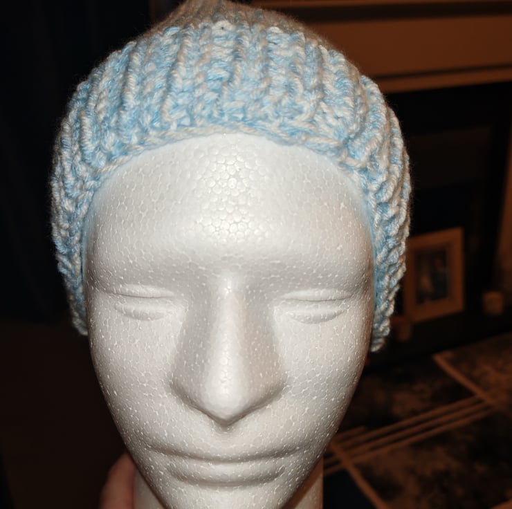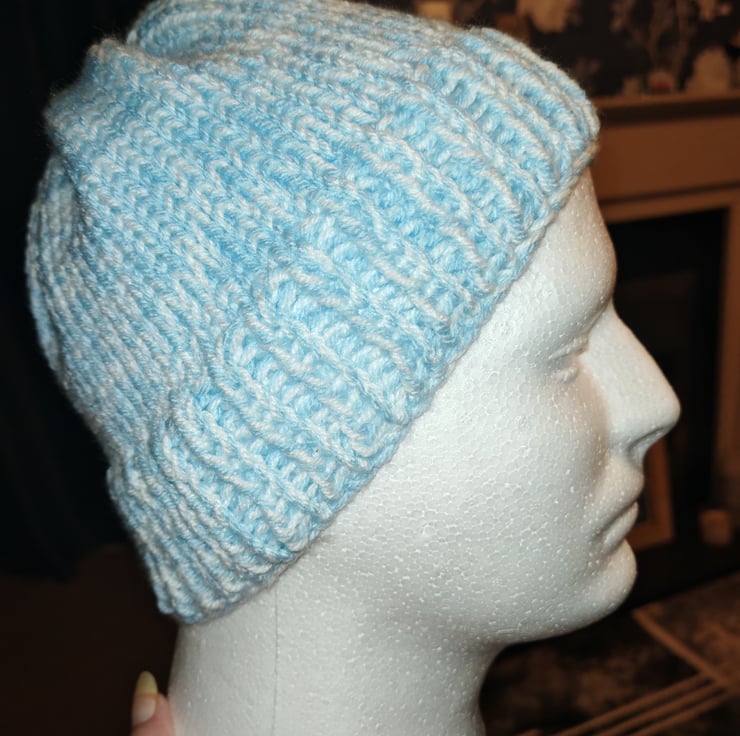 Handmade knit mens white and blue beanie, this beanie is both stylish and warm, a must have additional to your winter wardrobe