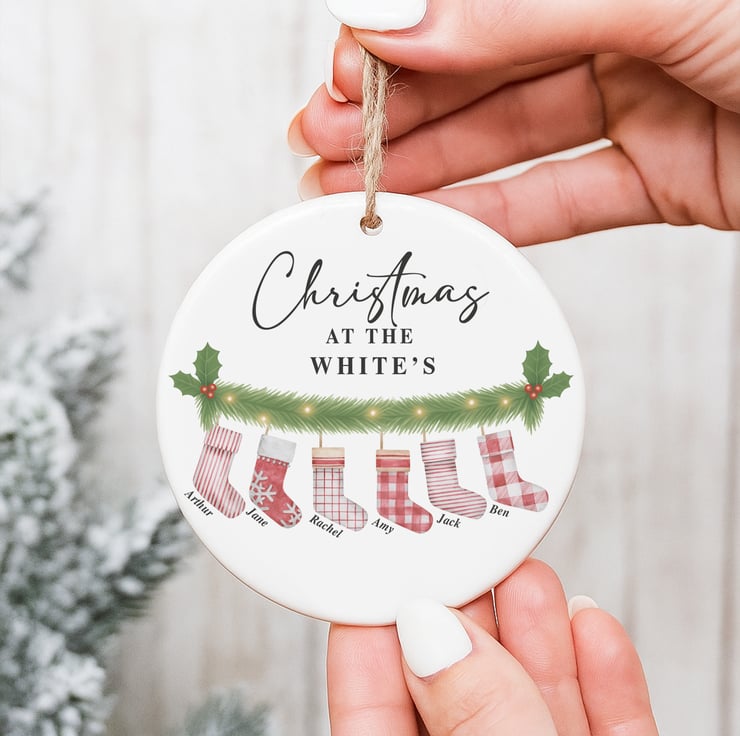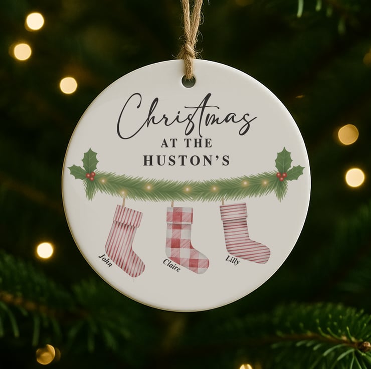 Decorate your tree with a cosy, classic look using this Personalised Christmas Stockings Bauble. Featuring charming red and white patterned stockings hanging from a glowing Christmas garland, this ornament is fully customised with your family’s names and size.