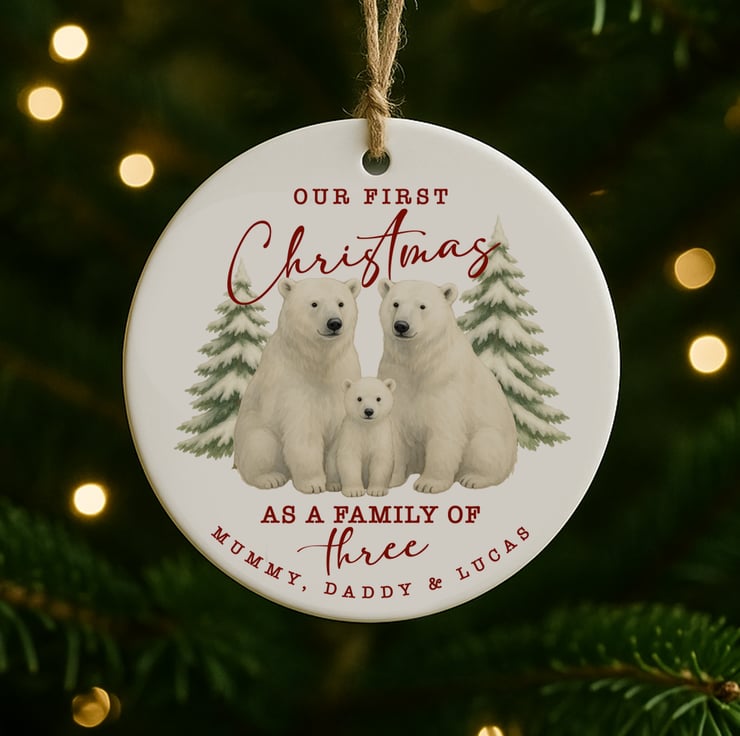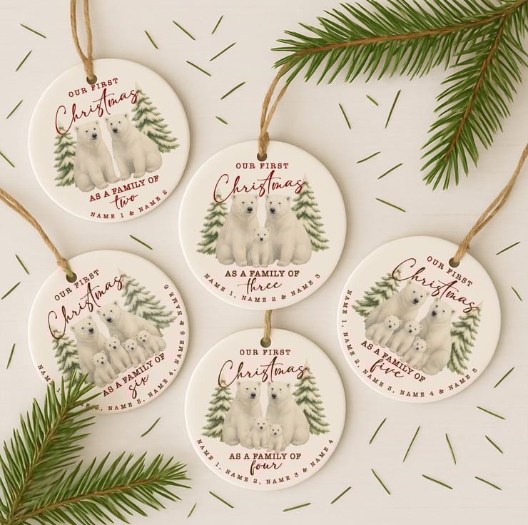 Celebrate your family's magical moments with this charming Polar Bear Family Christmas Bauble. Featuring adorable wintery bear illustrations under snow-tipped pines, this personalised ornament is made just for you—add your family size, names, and the year to create a keepsake you’ll cherish forever.