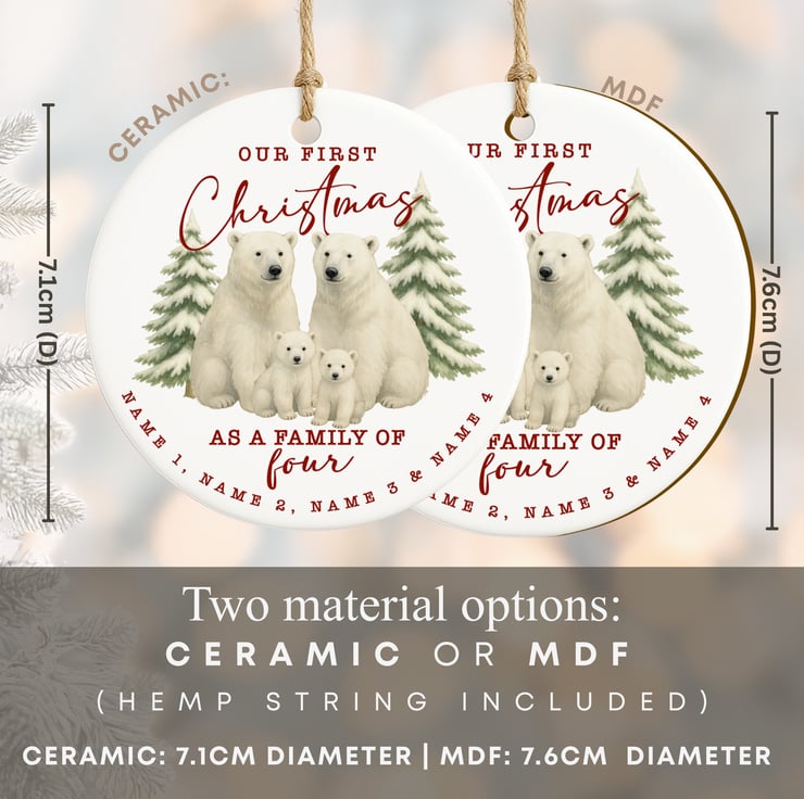 Choose between a premium ceramic bauble or a lightweight MDF version, both beautifully printed and finished with natural hemp string for a rustic Christmas feel. Whether it’s your first Christmas as a family, a gift for new parents, or a yearly tradition, this bauble brings warmth and charm to any festive tree.