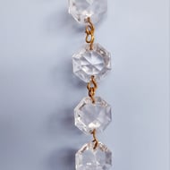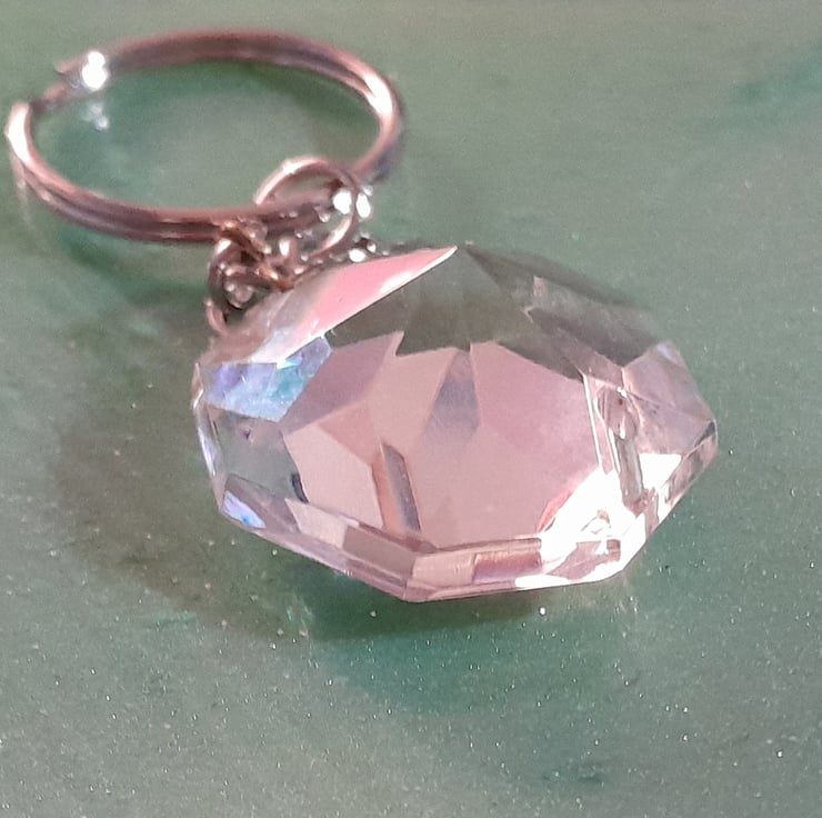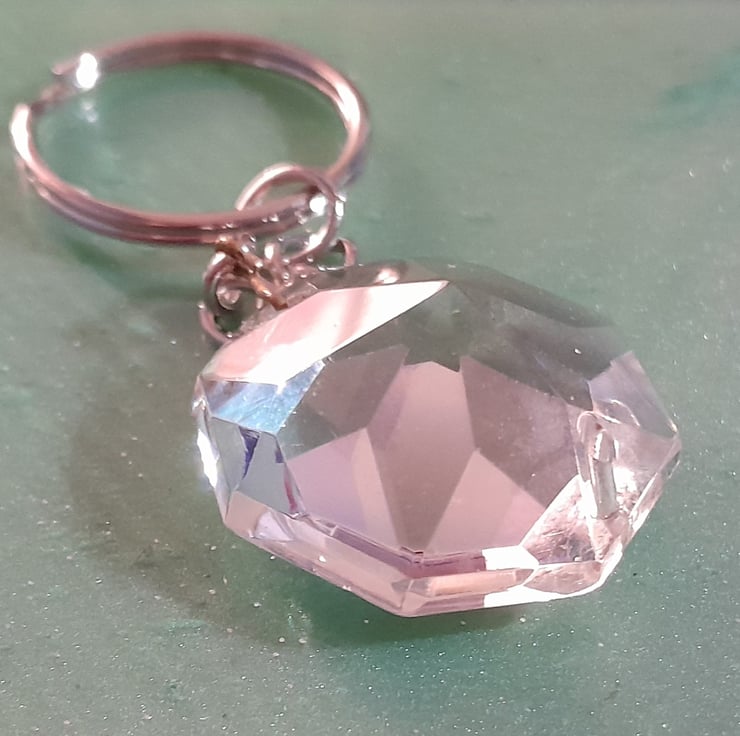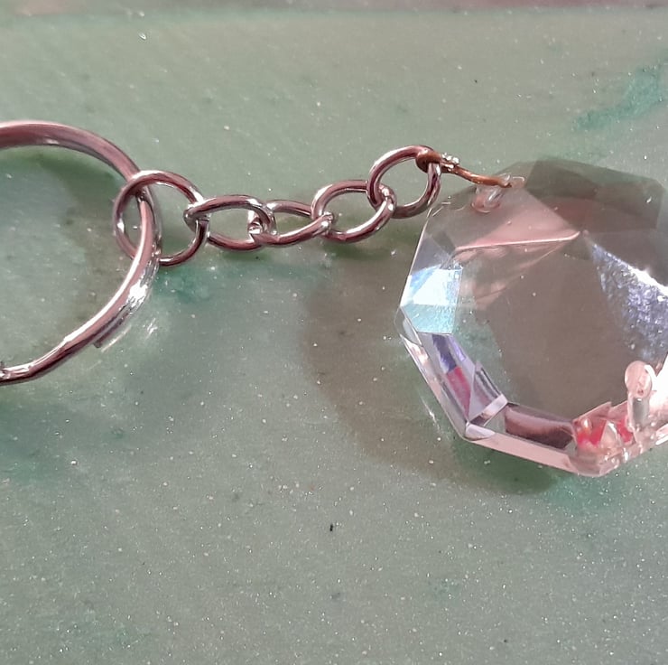 This is a crystal prism with a keyring chain. They are from a vintage chandelier with a hole at the top and bottom where they were attached on the chandelier, so may have some imperfections but are still beautiful.