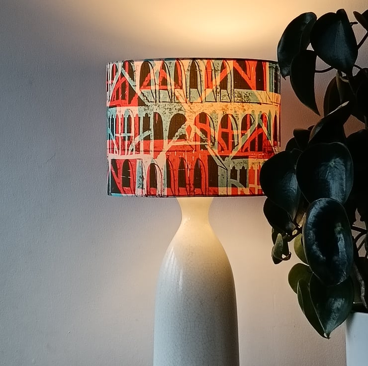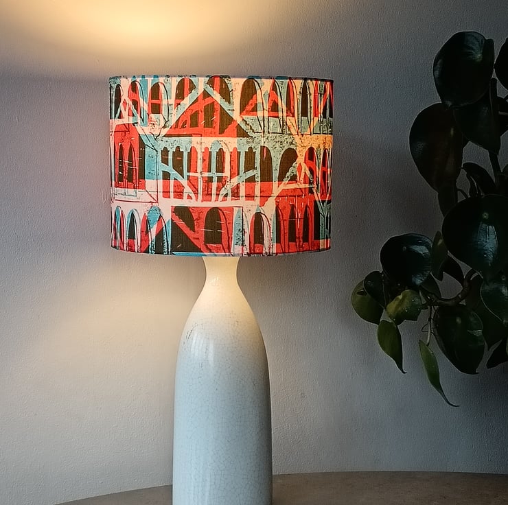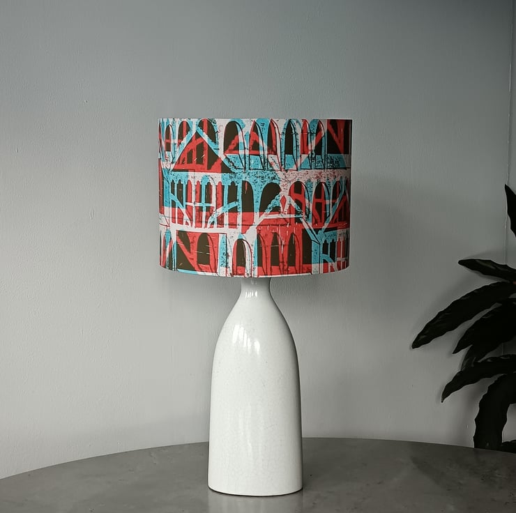 Liberty fabric 'Havinden Tudor' covering handmade drum lampshade in various sizes and you can choose either a pendant or lamp fitting.