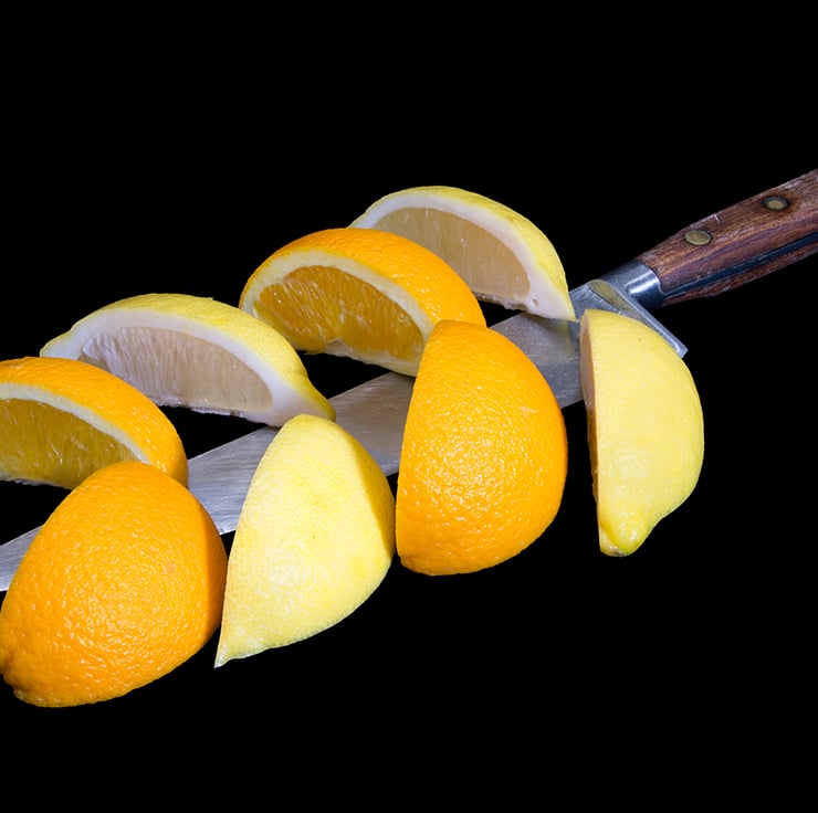 A still life creation of quartered oranges and lemons resting on top of the knife that committed the crime. An alternative version is available.