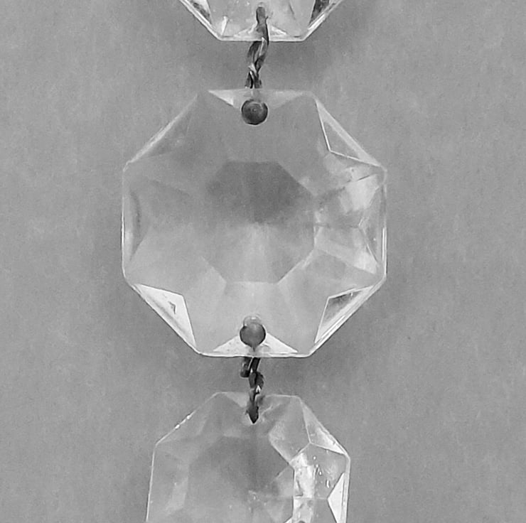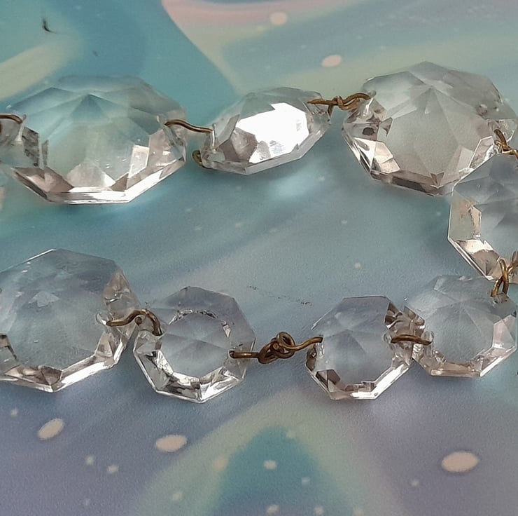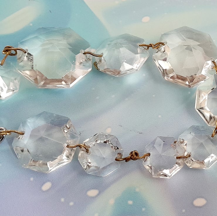 There are 9 octagonal crystals 15mm,25mm,20mm,25mm,20mm,15mm x 3, 20mm with original wire connectors and a keyring to hang them. They are from a vintage chandelier so may have imperfections. When hung the crystals reflect the lights around especially in the sun.