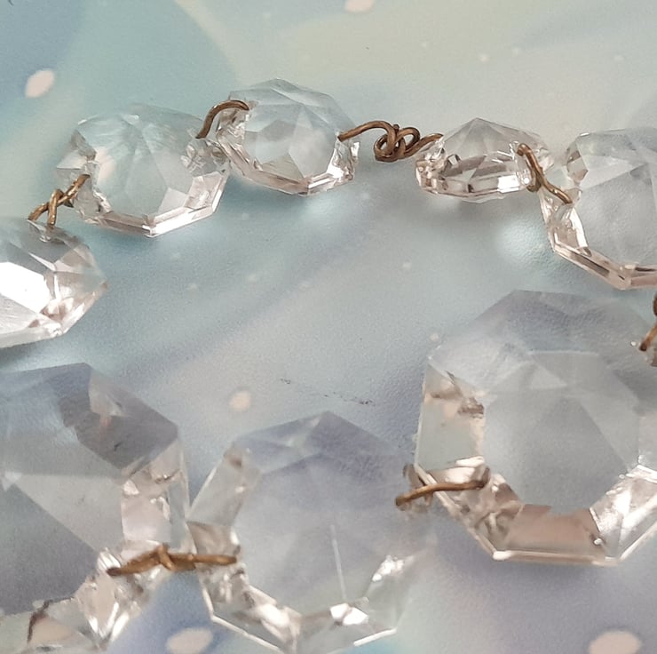 An old vintage chandelier. It had so many different shaped crystals when cleaned, were sparkling when caught in the lights. There were many possibilities so I have created a few different items. They are from an old chandelier so have a few imperfections but are still impressive. Obviously thought of Easter and summer days and attractive green trees, with these crystals catching the light and twinkling on the trees when the sun is out.