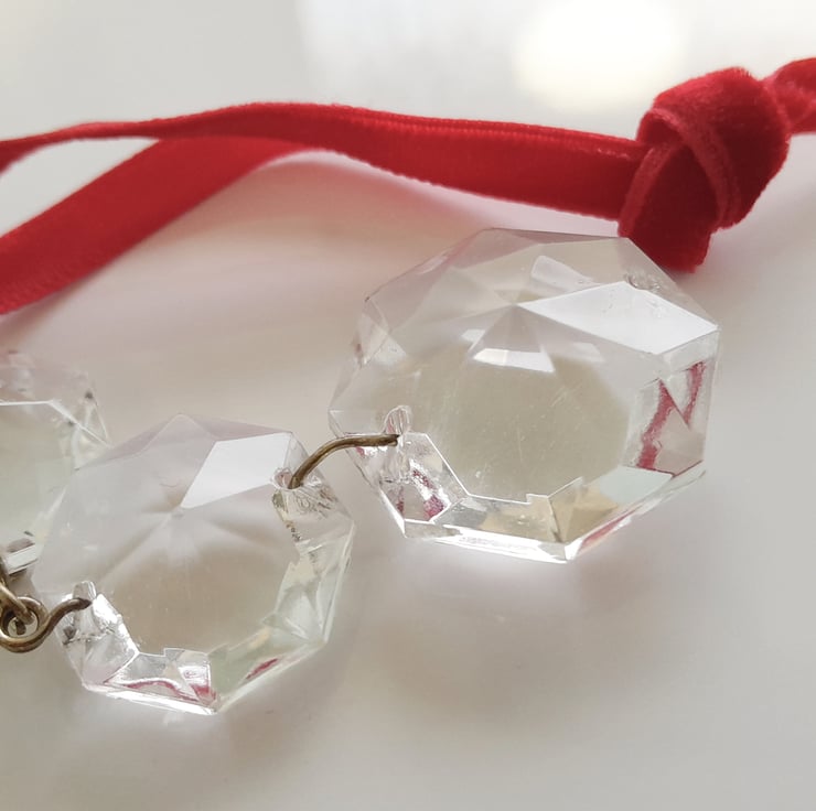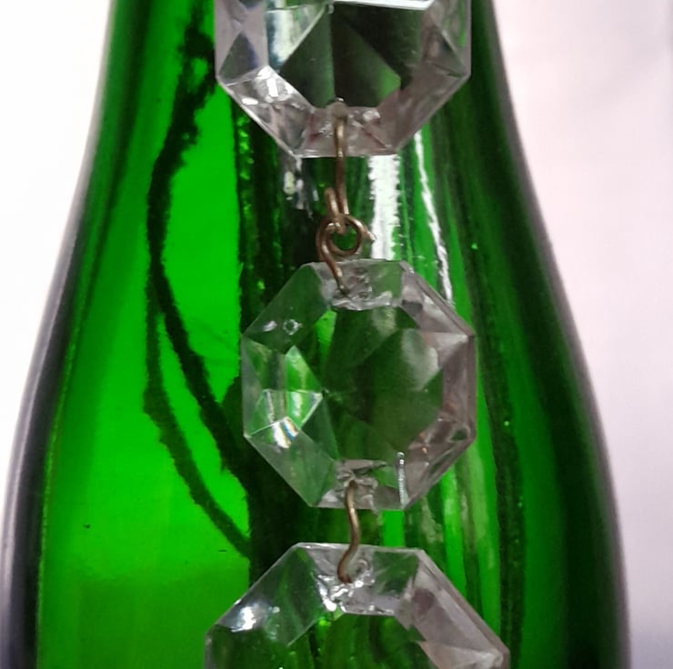 An old antique chandelier. It had so many different shaped crystals when cleaned, were sparkling when caught in the lights. There were many possibilities so I have created a few different items. They are from an antique chandelier so have a few imperfections but are still impressive. Obviously thought of Christmas, and attractive green trees, with these crystals catching the light and twinkling on the tree or outdoors when the sun is out.