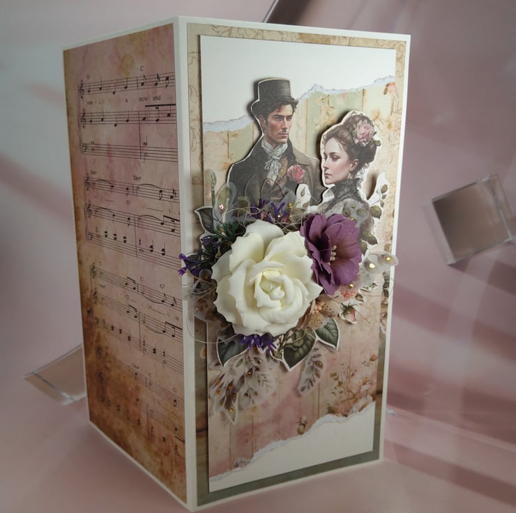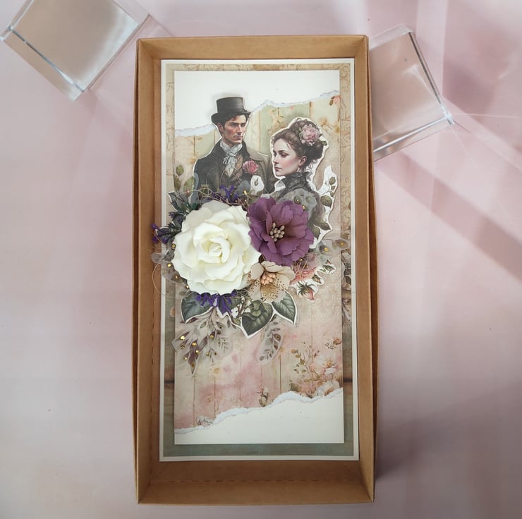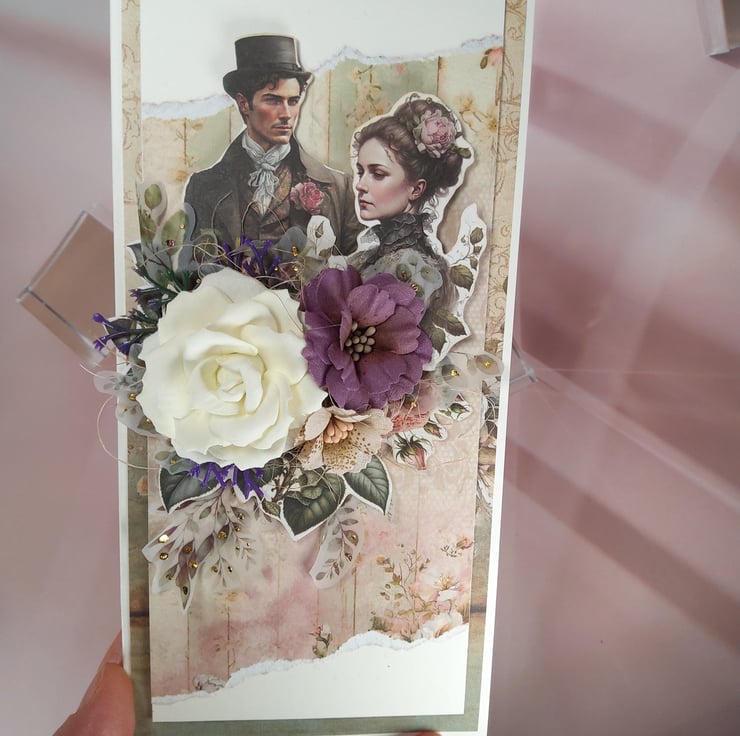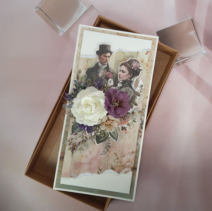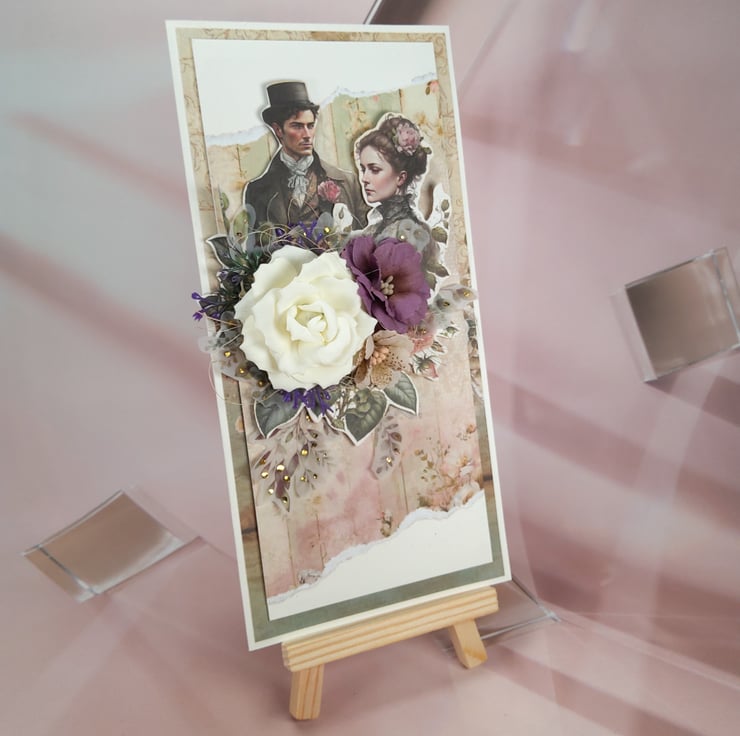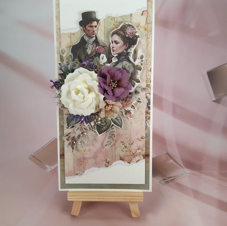 A beautifully handcrafted card in a luxurious vintage style, featuring an elegant Victorian-inspired couple and a richly layered floral arrangement. Soft romantic tones, textured details and deep purple accents create a unique keepsake perfect for many special occasions.