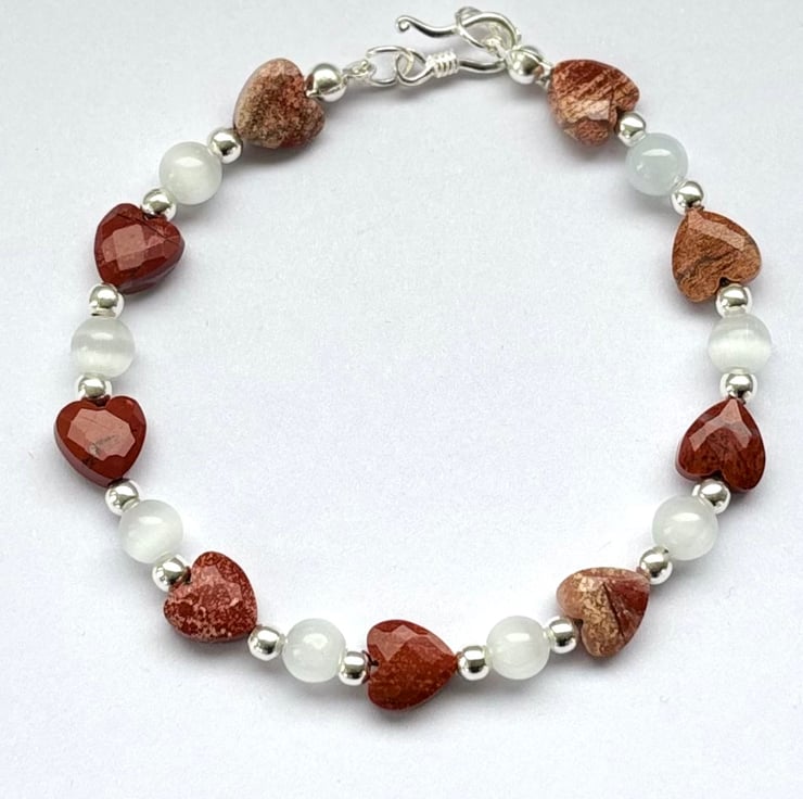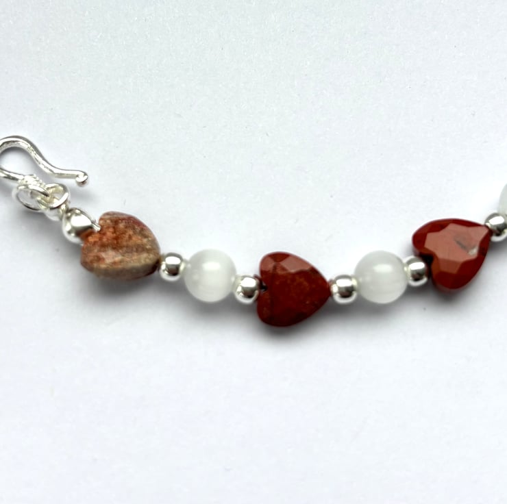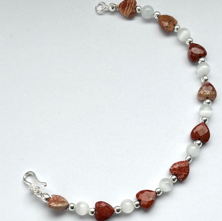 Red Jasper is known as the “stone of endurance” associated with physical strength, Stamina and passion, while selenite is used for clearing negative energy, I have merged these two powerful stones together in this eye catching bracelet, the jasper in dainty faceted hearts and selenite round beads, I have added 3 mm Sterling silver spacer beads and added a simple sterling silver hook clasp, it will fit a 7” wrist comfortably. It will be gift wrapped before posting.