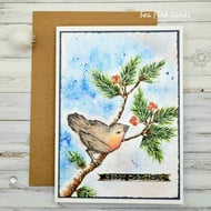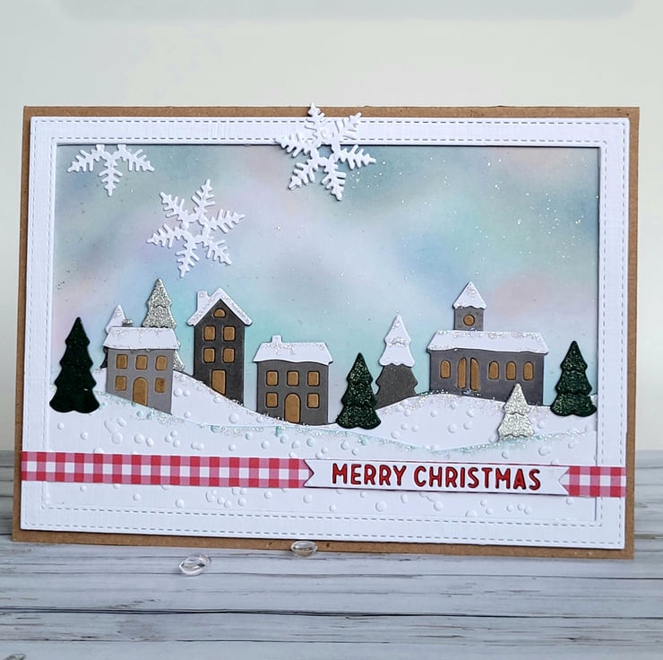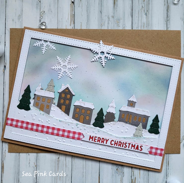 This christmas card has a layered, dimensional design, with textured snowy hills which I have embossed, there is also a little pop of festive red with red checked paper. This special christmas card has an atmospheric winter sky created with archival inks and brushes and lightly splattered it with tiny drops of water-based shimmer ink. I die-cut and layered some snowflakes too. I have die-cut the village from shades of grey card, adding details to the little houses and church. The trees are grey, silver and deep green and have subtle shimmer. The card has been enhanced with non-shedding sparkling glitter glue. Delivery is by Royal Mail in a clear card wrapper and a brown recyclable board-backed envelope.