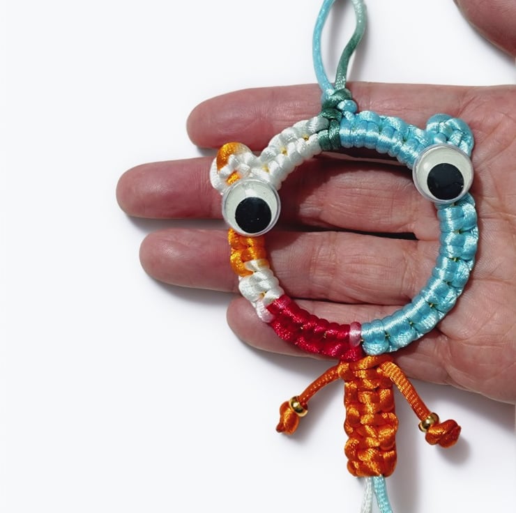 Bursting with color and character, this handmade gecko charm is a joyful celebration of playful design. Crafted using macramé techniques, its circular body features a rainbow of threads—light blue, white, red, orange, and yellow—knotted with care and crowned with googly eyes that bring it to life.
