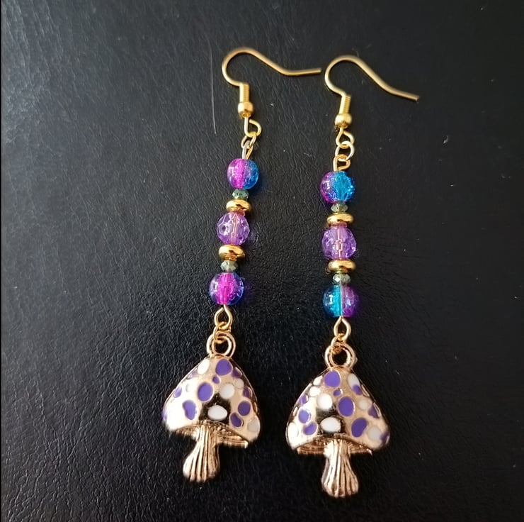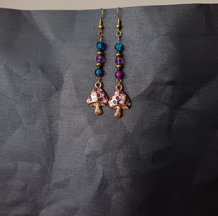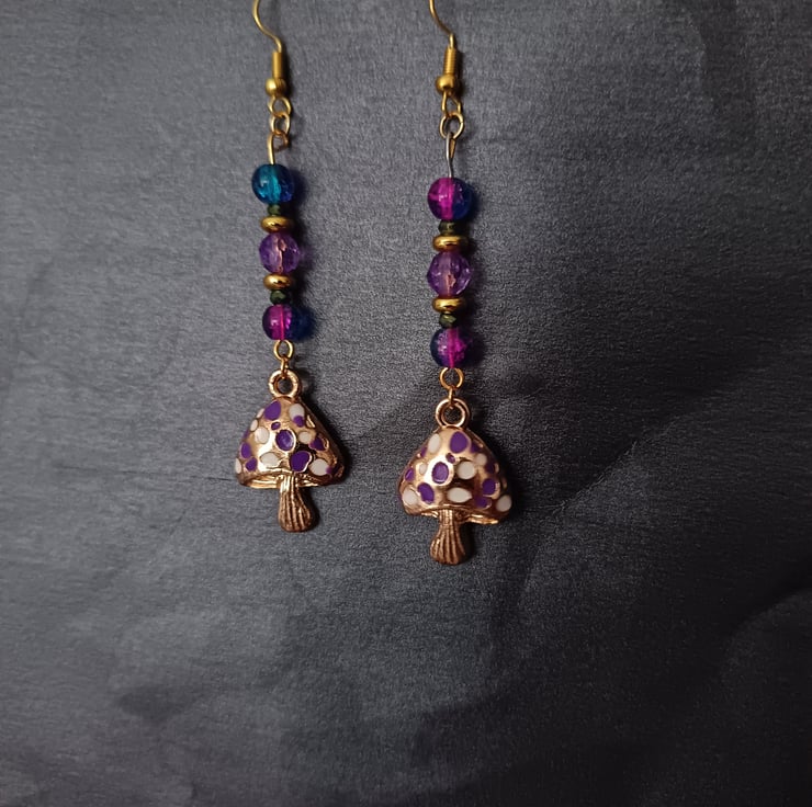 These handmade earrings are crafted with gold stainless steel hooks, enamel toadstool charms in purple, white and gold, as well as gold decorative spacers and glass beads in grey, purple and blue.