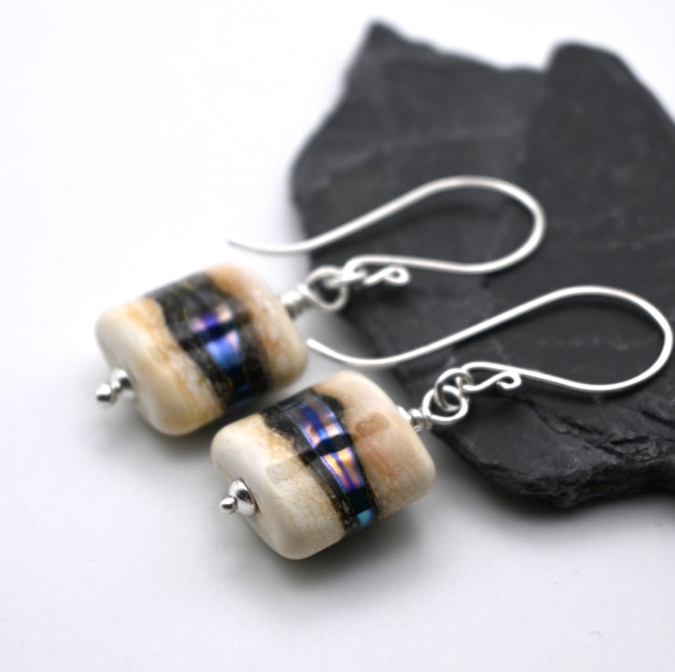 The lampwork beads have been handmade by me using ivory and metallic blue glass, they have been shaped using a brass press.