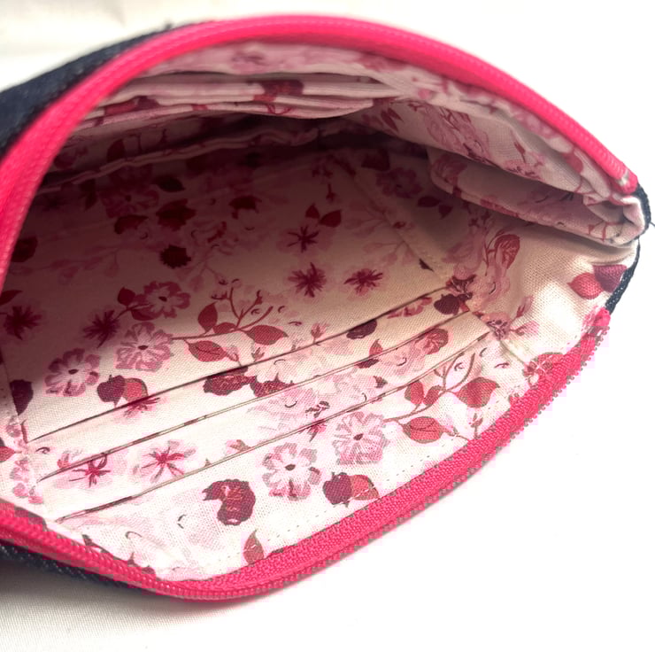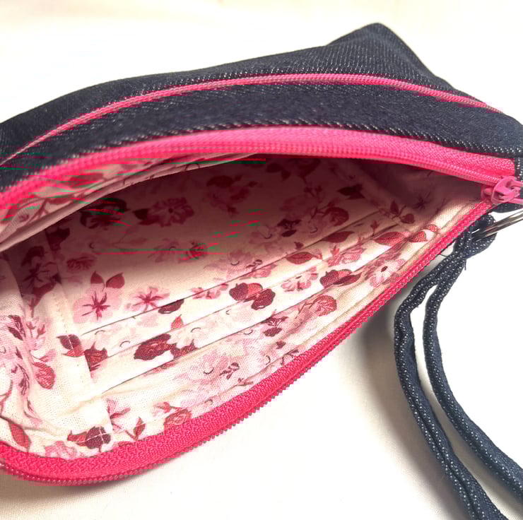 Handmade denim wristlet bag. Made with denim. Inside has six card slots and a pocket in the front. Handy for a night out.