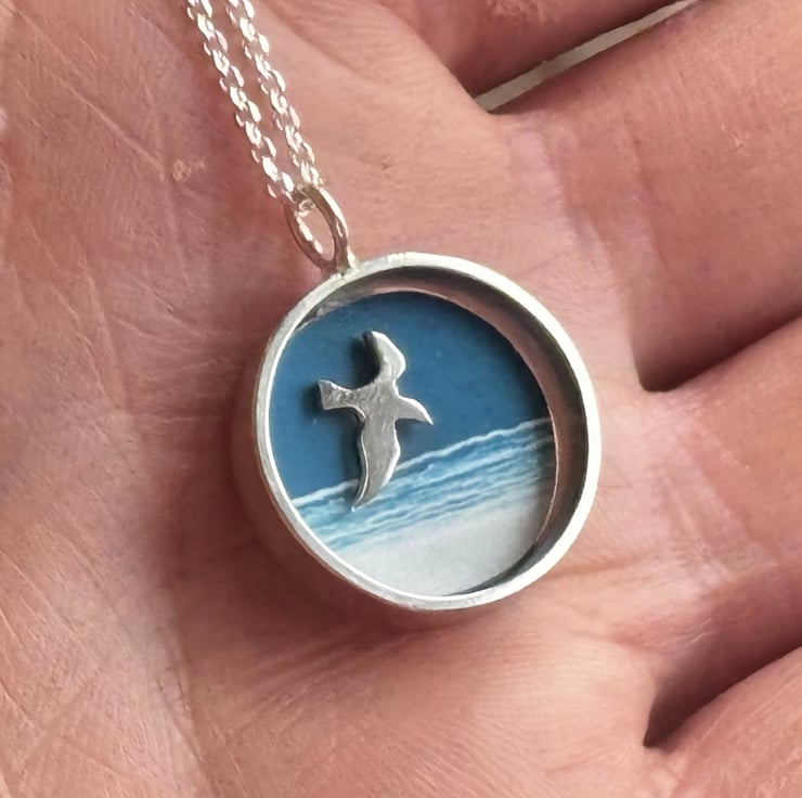 A cute framed necklace featuring a little silver seagull flying on a dark blue and white background suggesting the sea. The background is made from anodised aluminium which has been hand dyed. The scene is set inside a sterling silver deep circle polished to a shiny finish. Hung from an 18 inch sterling silver chain (Please message me if you prefer a different length).