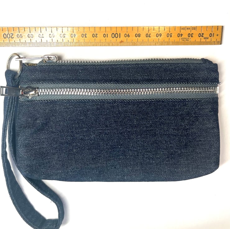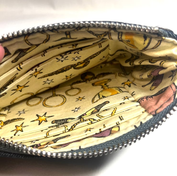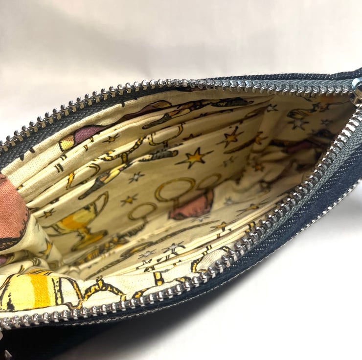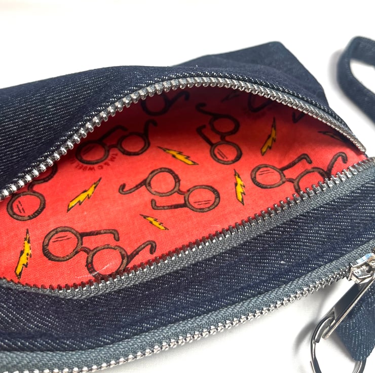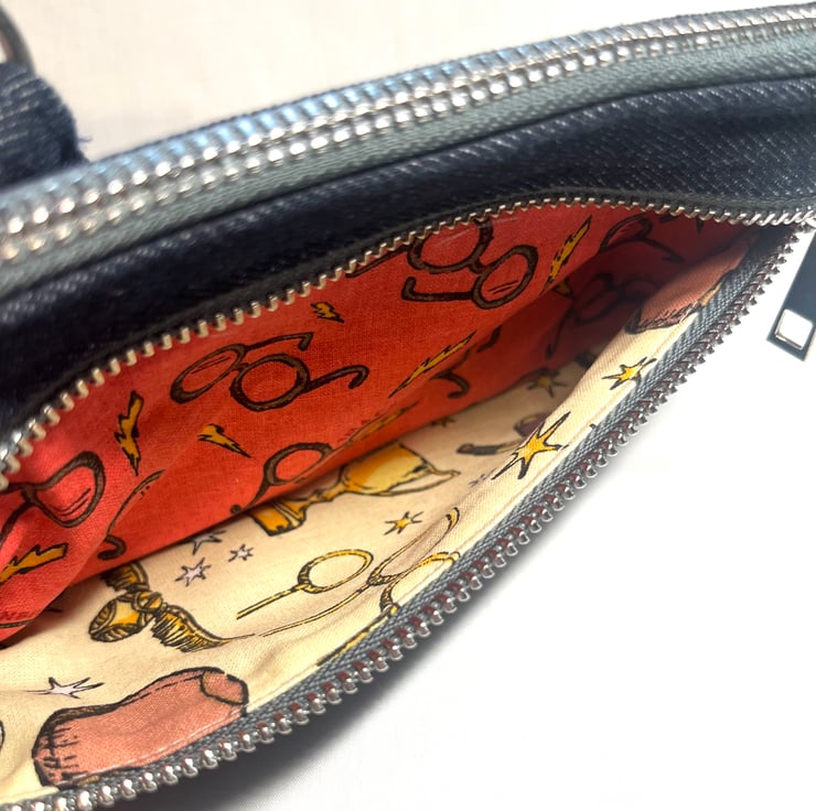 Handmade wristlet wallet. Made from denim. On the inside is made with Harry Potter fabric. It has six card slots and a front pocket.