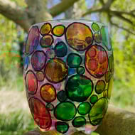This candleholder is my newest project, made because I wanted to experiment. I painted background first, covering it with nearly transparent medium, and then dropped different colours paint on it and spin it till it created natural looking waves and ripples. That pattern made me think of how wind shapes sand and hence the idea of dessert themed lantern was born.
