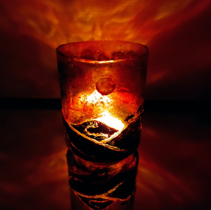 This candle holder is also unusual, because I’m trying out new containers to paint on- namely, jars with cut off tops- to be more sustainable and more adventurous as jars comes with all shapes and sizes. The cut top of glass is sanded down to the best of my ability to avoid any cut and wounds from handling.