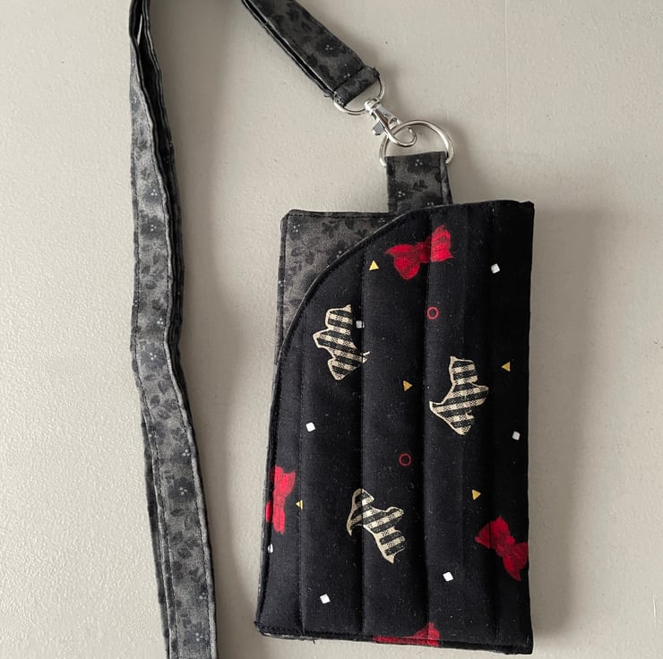 The case is black with a red bow and check scottie dog design with a grey floral lining and matching lanyard.