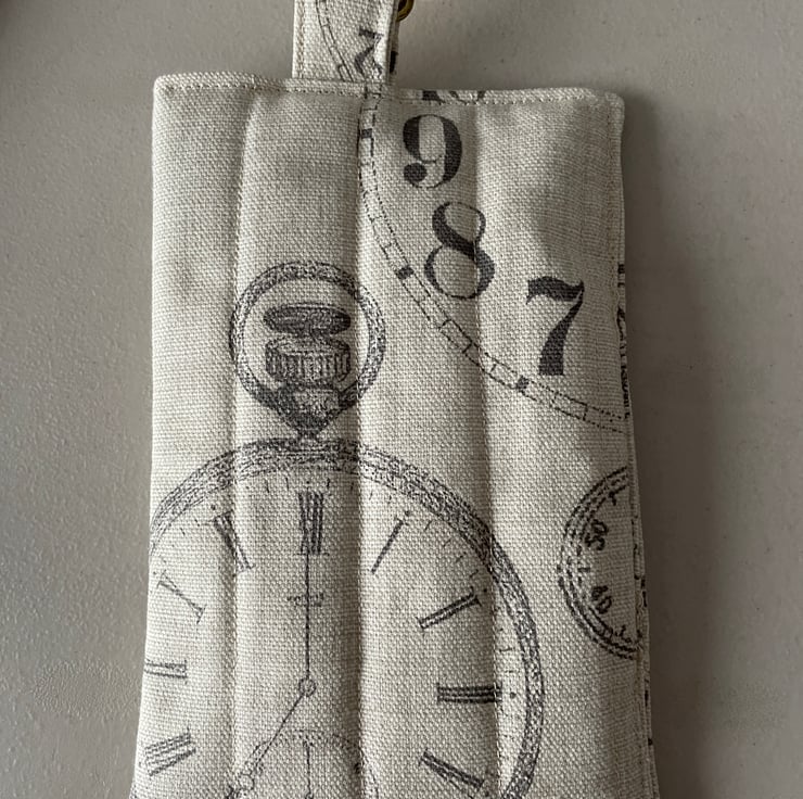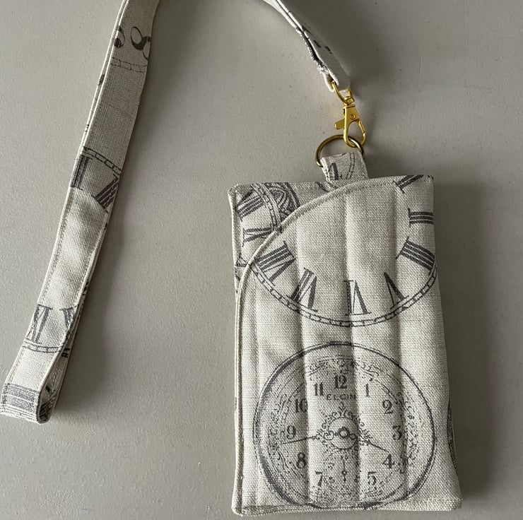 The case is in a beige material with clock design and matching lining and matching fabric lanyard.