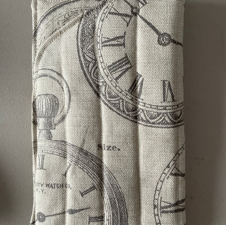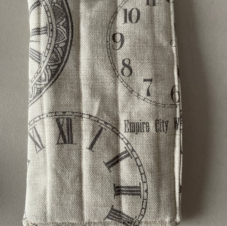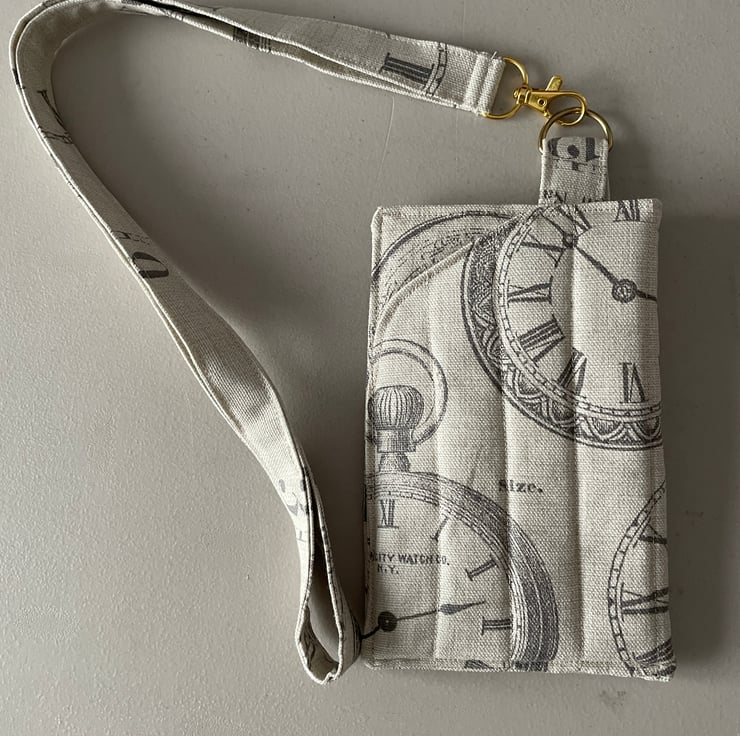 The case is in a beige material with clock design and matching lining and matching fabric lanyard.