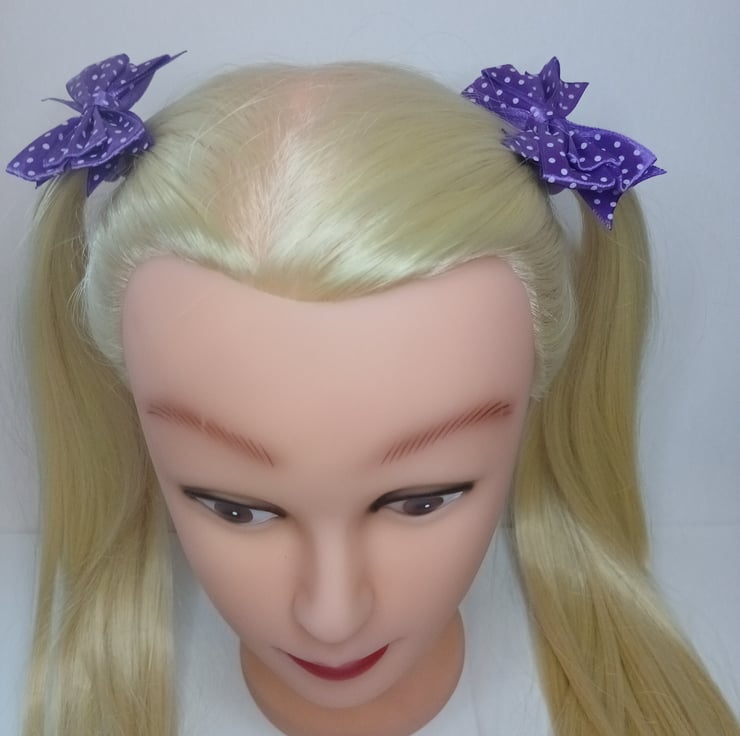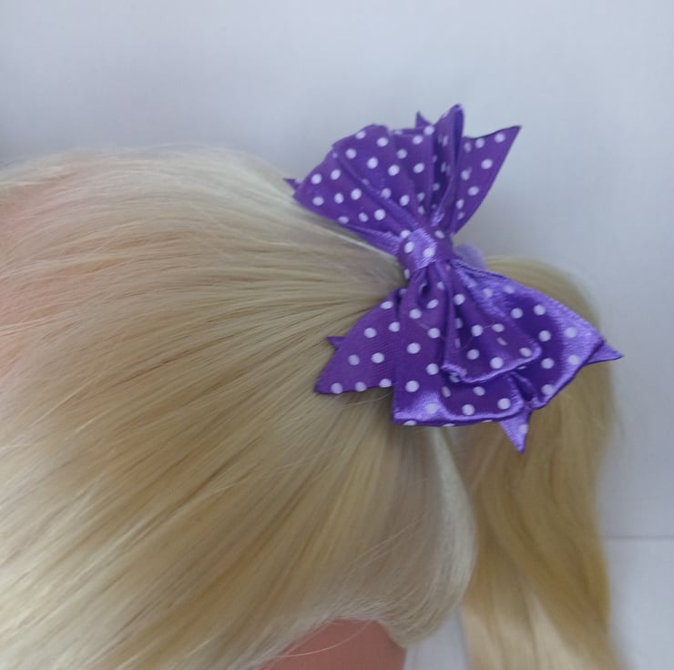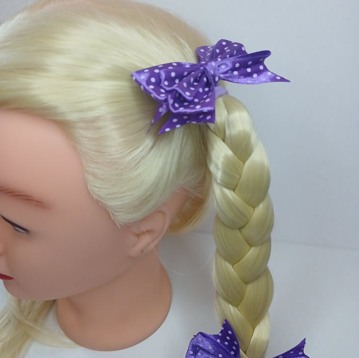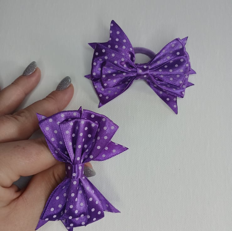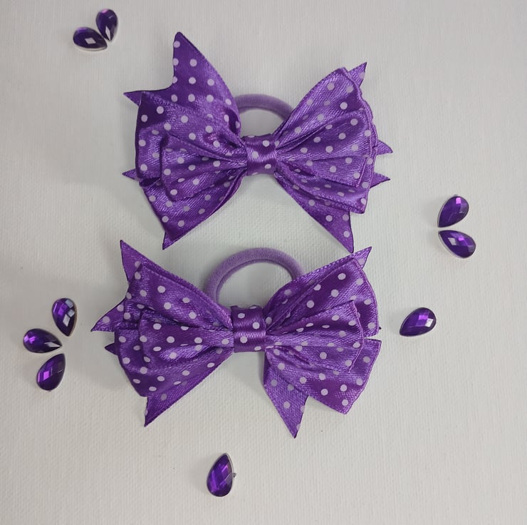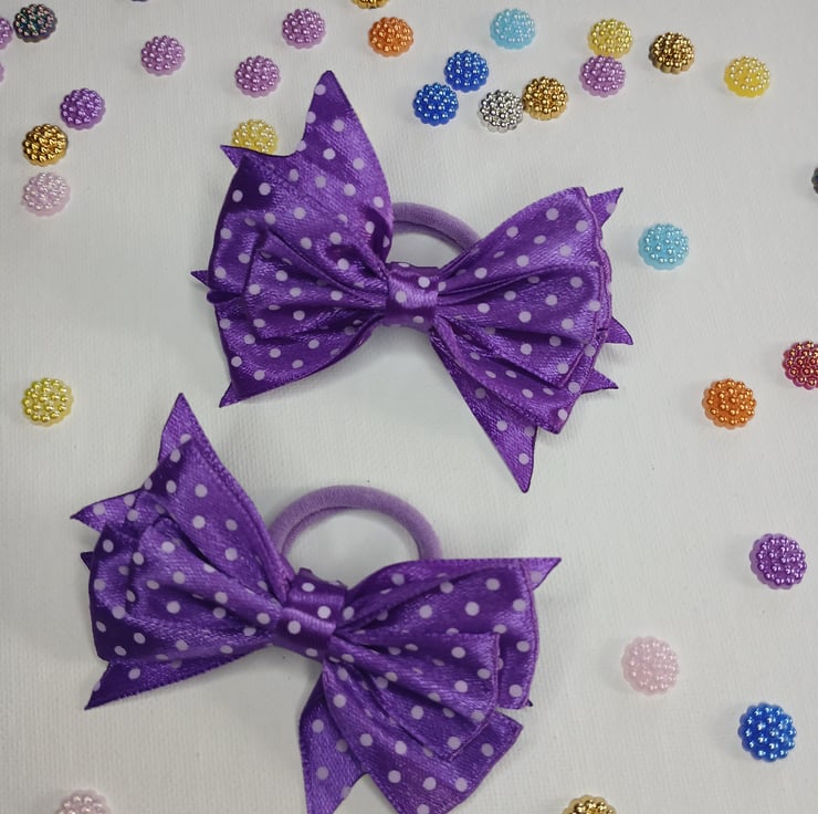 Crafted from vibrant purple ribbon with delicate white polka dots, the bows are layered for extra volume and elegance. The elastic bands are durable yet gentle, designed to hold hair securely without pulling.