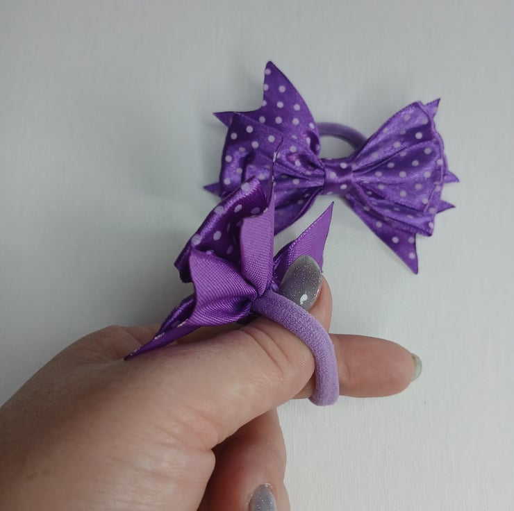 Add a touch of playful charm to your hairstyle with this set of handmade purple bow hair ties. Each accessory measures approximately 7 x 10 cm, making them the ideal size for ponytails, braids, or decorative styling.