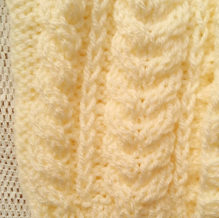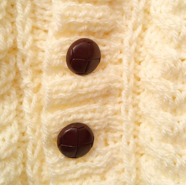 Unisex cabled cardigan with a collar, it has a cable pattern on the front and back. It can be made in a colour of your choice in aran weight yarn.